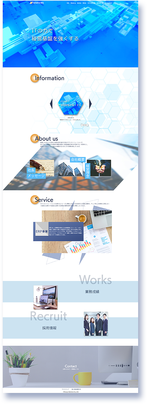 株式会社ネクシスソリューションズの公式サイトのリニューアルプロジェクトでデザインを担当しました。IT企業のイメージを強く出せるよう、鮮やかなブルーとホバーアクションをふんだんに使用しました。