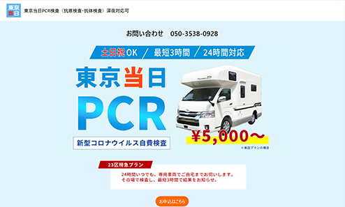 PCR検査サービス『東京当日PCR』のランディングページ内で使用するメインビジュアル部分と検査のフロー図、タイトル部分の装飾のデザインを担当しました。