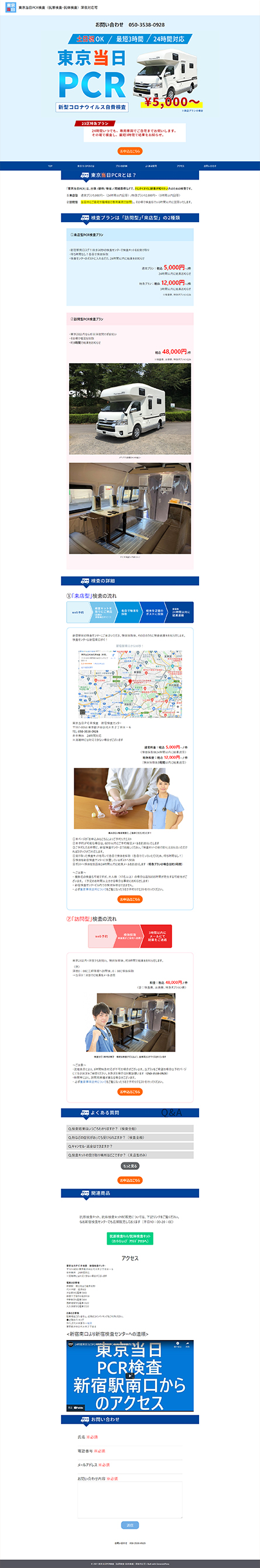 PCR検査サービス『東京当日PCR』のランディングページ内で使用するメインビジュアル部分と検査のフロー図、タイトル部分の装飾のデザインを担当しました。